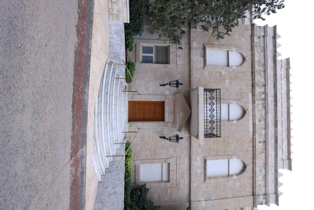 وبصعود الدرج، إلى اليمين أو إلى اليسار، تواجه المرءَ لوحةٌ زجاجية تغطي القوس الأوسط للبناء بكامله، وهي من نوع بديع مرسوم وملون بطريقة الفن التشكيلي، استُخدم فيها الزجاج الملون بأشكال تعبيرية متناسقة تمثل الواجهة الأمامية للقصر.