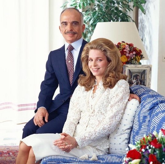 تلقّت جلالتها تعليمها في مدارس كاليفورنيا وواشنطن ونيويورك، وتخرجت في جامعة برينستون عام 1974، ونالت شهادة في العمارة والتخطيط الحضري بامتياز، ثم سافرت إلى منطقة الشرق الأوسط، وعملت في الأردن للإفاضة من خبرتها في تطوير المطار، وتم زواجها من جلالة الملك الحسين بن طلال في 15 حزيران 1978. وقد أنعم الله عليهما بسموّ الأمير حمزة في 29 آذار 1980، وسموّ الأمير هاشم في 10 حزيران 1981، وسموّ الأميرة إيمان في 24 نيسان 1983، وسموّ الأميرة راية في 9 شباط 1986.